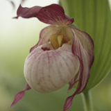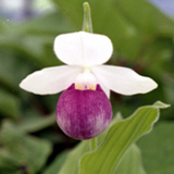 アメリカ北部からカナダ東部にかけて分布。花形、花色、草姿の何れも美しいアツモリソウです。この花の特徴はセパル(上花弁)ペダル(側花弁)は純白でリップ(唇弁)が紅色からほのかに淡紅色に色付く。淡い色合いが日本人好みの品種。
