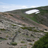 大雪山系赤岳の頂上付近にて2007年7月24日撮影。 残雪が残る岩肌にはハイマツや高山植物が転々と生えてます。